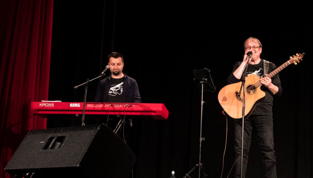 The headliners were Emeric Imre and Tituș Constantin. In addition to the two, local artists performed. I entered the hall at 8 pm and left at 11 pm and a bit. The local artists lingered a bit and Tituș told them : “sigh, I thought we settled on performing just 5 songs per artist”. Eh, what can you do, just about any man would like to prolong his moment as a movie star when he is on stage. Come on, would you say that if all the spotlights were on you and if you could see the sparkles in the eyes of those who were staring in amazement at your fingers moving like a river on the guitar and at your voice that makes the sun dance that you wouldn’t want just a tad bit more of the attention cake?