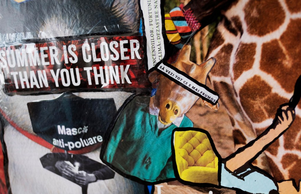 I see a future with rising temperatures and polluted air. I wanted to depict the loss of a lot of species by illustrating a giraffe split in two while people are taking selfies and ignoring what happens in reality. I have put QR codes as we will probably have to use them in order to see how some animals used to look like back in the days when they existed. On top of the cat with the mask I have illustrated the sadness of what it means to have your environment destroyed due to man’s actions: natural disasters, more fires lead to a bleak planet to live on. There is nothing exciting to see for the woman and her children. I have used scotch tape to show how life has become more like plastic. Literally. The future that we will have 100 years from now is going to make us return to the old days when what was there was not appreciated and for sure when it comes to climate change and loss of species we already see the effects nowadays.